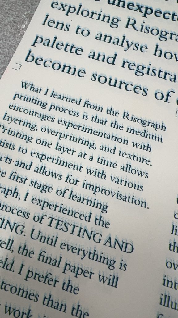 What I learned from the risograph printing process is that the medium encourages experimentation with layering, overprinting, and texture. Printing one layer at a time allows artists to experiment with various effects and allows for improvisation. I experienced the whole process of testing and adjusting. Until everything is working well, the final paper will be on the field. I prefer the risograph outcomes than the digital painting since I see the blending of inks.